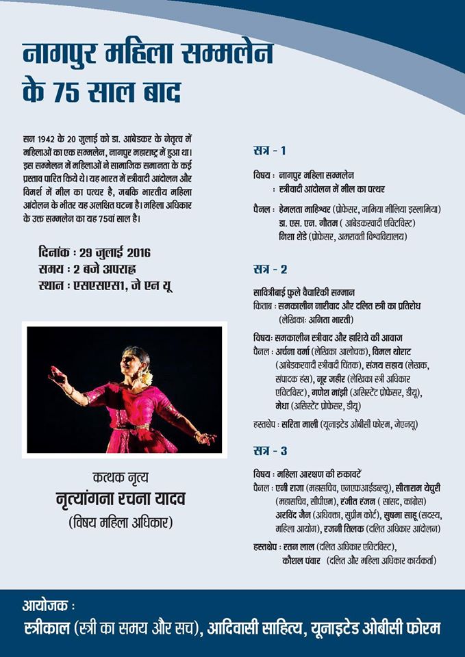 सन 1942 के 20 जुलाई को डा. आंबेडकर के नेतृत्व में महिलाओं का एक सम्मलेन, नागपुर महाराष्ट्र में हुआ था. इस सम्मेलन में महिलाओं ने सामाजिक समानता के कई प्रस्ताव पारित किये थे. यह भारत में स्त्रीवादी आंदोलन और विमर्श में मील का पत्थर है, जबकि भारतीय महिला आंदोलन के भीतर यह अलक्षित घटना है. महिला अधिकार के उक्त सम्मलेन का यह 75वां साल है. इस अवसर पर स्त्रीकाल, स्त्री का समय और सच (स्त्रीवादी पत्रिका) आदिवासी साहित्य और यूनाइटेड ओबीसी फोरम के संयुक्त तत्वावधान में जवाहर लाल नेहरू विश्वविद्यालय में महिला आरक्षण सहित अलग –अलग विषयों पर बातचीत आयोजित कर रही है. इस अवसर पर पत्रिका अनिता भारती की किताब ‘समकालीन नारीवाद: दलित स्त्री के प्रश्न’ को सावित्री बाई फुले साम्मान भी देगी. कार्यक्रम के अंत में महिला अधिकार विषय पर प्रसिद्द्ध कत्थक नृत्यांगना रचना यादव की नृत्य प्रस्तुति होगी.