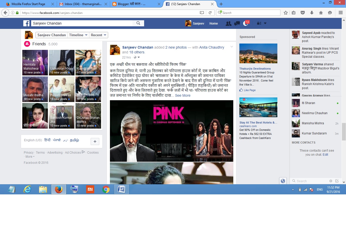 कल रियल दुनिया मे, यानी 20 सितम्बर को पटियाला हाउस कोर्ट में, एक काबिल और कमिटेड ऐडवोकेट वृदा ग्रोवर को ‘बलात्कार’ के केस मे अभियुक्त की जमानत याचिका खारिज किये जाने की असफल गुजारिश करते देखने के बाद रील की दुनिया में यानी ‘पिंक’ फिल्म में एक अति नाटकीय वकील को अपने मुवक्किलों ( पीड़ित लड़कियों) को जमानत दिलावाते हुए और केस जितवाते हुए देखा. फर्क जजों में भी था- पटियाला हाउस कोर्ट का जज जमानत पर निर्णय के लिए चार्जशीट दाखिल तक का इंतजार कर रहा है, यानी अधिकांश स्थिति में वह अभियुक्त को जमानत देने ही वाला है, जबकि उसे जेल में होना चाहिए -कानूनन भी. लेकिन फिल्म का जज हाव भाव से लडकियों के पक्ष में’ दयालू, और ईमानदार’ दिखता रहा- जिसे निर्णय वही देना था, जो उसने फिल्म के आखिर में दिया.