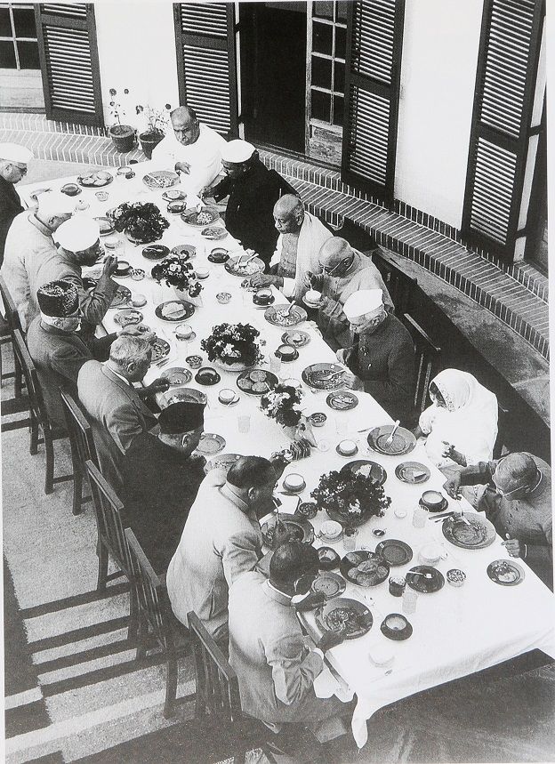 चक्रवर्ती सी राजगोपालाचारी के भारत के प्रथम गवर्नर जनरल बनने के उपलक्ष्य में सरदार पटेल द्वारा जून 1948 में आयोजित किए गए भोज समारोह में प्रधानमंत्री नेहरू के साथ अम्बेडकर और केन्द्रीय मंत्रीमंडल के अन्य सदस्य..