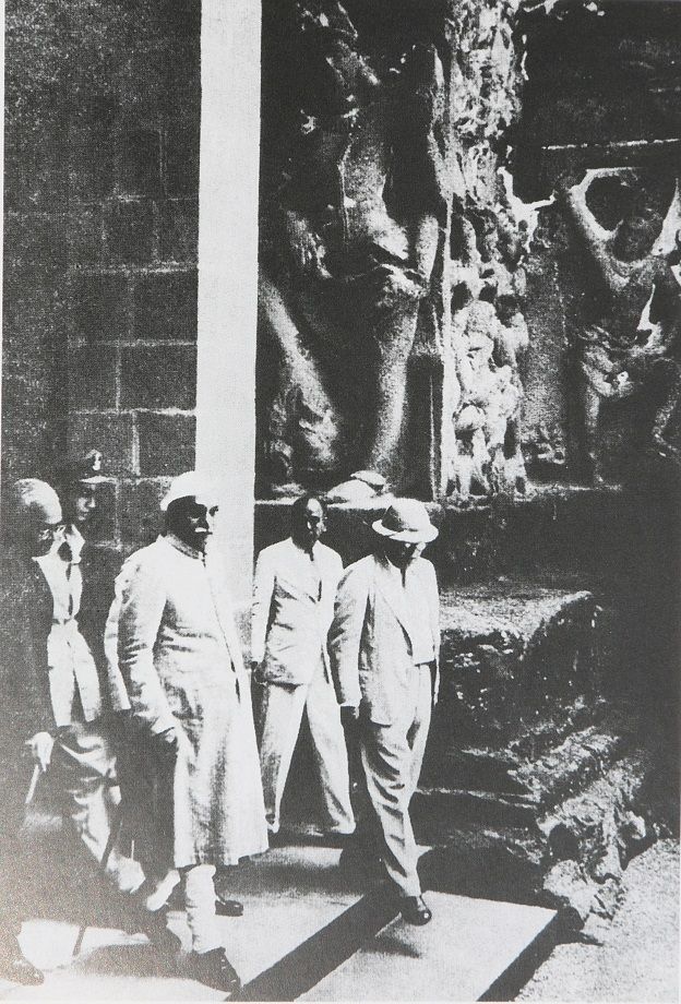 औरंगाबाद में महाविद्यालय की इमारत के शिलान्यास के बाद अम्बेडकर डॉक्टर राजेन्द्र प्रसाद को वेरुल की गुफाएं दिखाने ले गए. तस्वीर एक सितम्बर, 1951 की है.