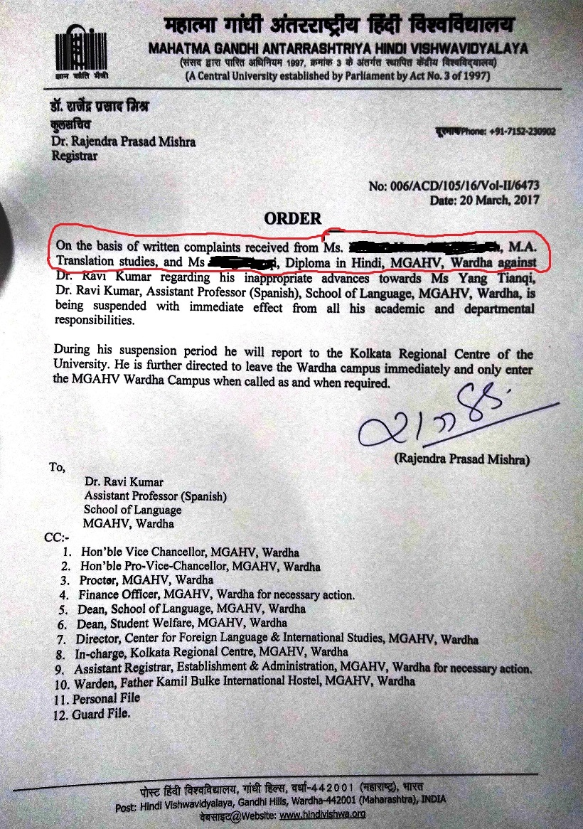 गांधी अंतरराष्ट्रीय हिन्दी विश्वविद्यालय वर्धा ( केन्द्रीय विश्वविद्यालय) के कुलसचिव के हस्ताक्षर से उसकी वेब साईट पर एक नोटिस लगी. यह नोटिस चीनी छात्राओं द्वारा यौन उत्पीड़न के आरोप पर विश्वविद्यालय के एक असिस्टेंट प्रोफ़ेसर के निलंबन की है. एक्ट की धारा 16 कहती है कि पीडिता का नाम और पहचान जांच चलने तक उजागर नहीं करना चाहिए , जबकि इस नोटिस में पीड़िताओं नाम स्पष्ट रूप से जाहिर किये गये हैं.
