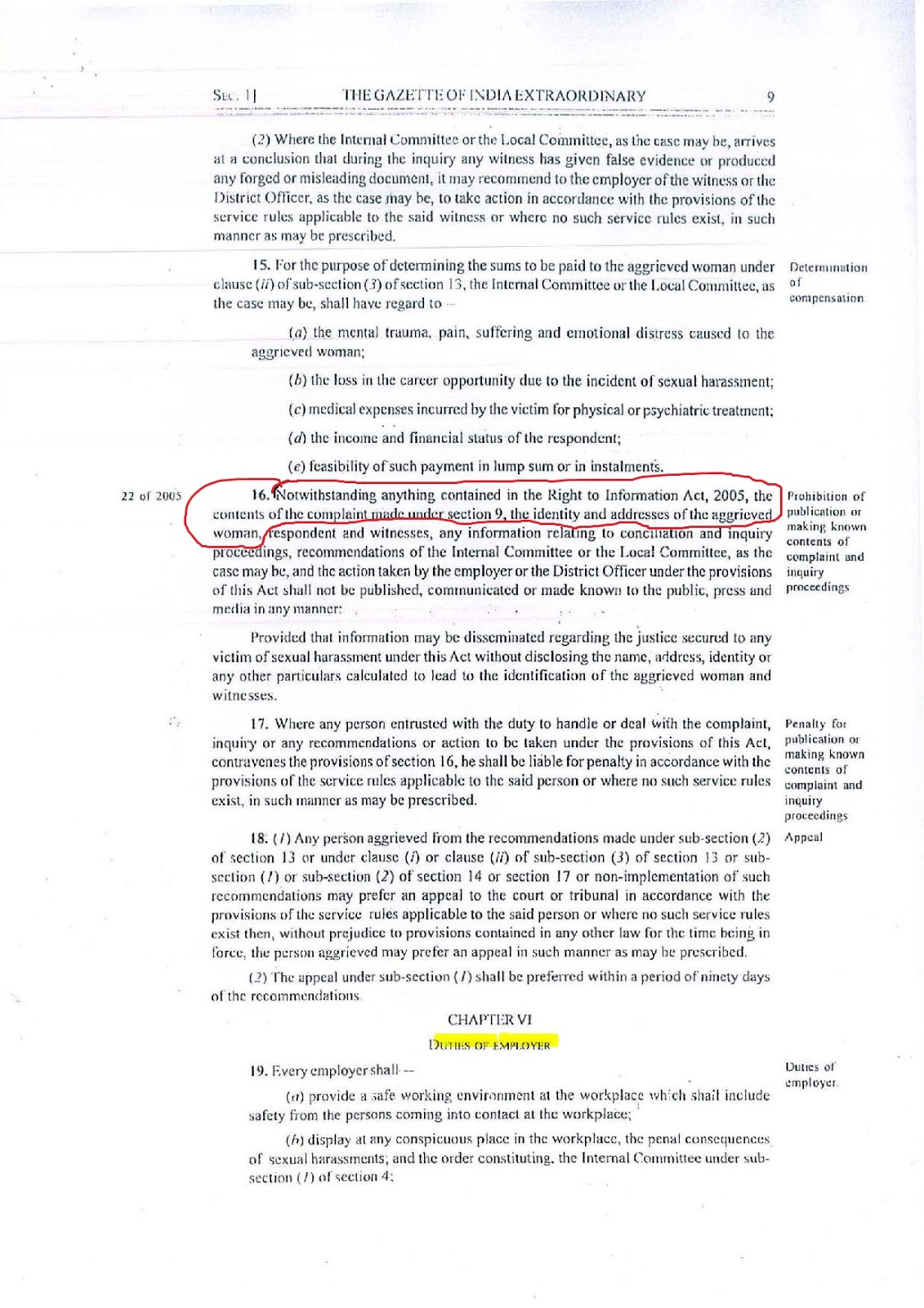 कार्य स्थलों पर महिला कर्मियों के यौन उत्पीडन को लेकर 2013 में क़ानून बना. इसके पहले कार्यस्थलों पर यौन उत्पीड़न के प्रसंग में 1997 में सुप्रीम कोर्ट द्वारा विशाखा बनाम राजस्थान बनाम सरकार के मामले में दिये गये दिशानिर्देश का अनुसरण किया जाता था, जिसे विशाखा गाइडलाइन भी कहा जाता है. 2013 में बना क़ानून कार्यस्थलों पर यौन उत्पीडन के मामले में बहुत स्पष्ट प्रावधान करता है. उसके प्रावधानों में धारा 16 के अनुसार शिकायतकर्ता पीडिता के नाम, उसकी पहचान आदि को जांच के दौरान जांच समिति या नियोक्ता जाहिर नहीं कर सकता है. यदि ऐसा वह करता है तो धारा 17 में उसपर स्पष्ट कार्रवाई का प्रावधान है.