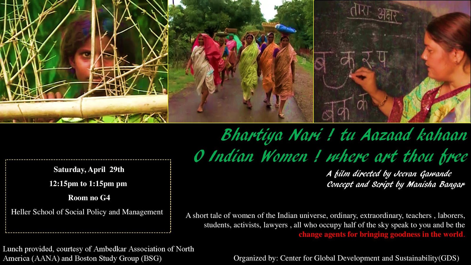 शनिवार , 29 अप्रैल 2017, को यूनाइटेड स्टेटस में ‘ब्रैंडिज युनिवर्सिटी, बोस्टन’ के द हेलर स्कूल के एंफी थिएटर में इस फिल्म का पहला शो 12.15 मिनट पर होगा. जीवन गावंडे द्वारा निर्देशित, मनीषा बांगड़ की पटकथा और कांसेप्ट पर बनी बेहद कम बजट वाली इस फिल्म का निर्माण बामसेफ और एएएनए के कार्यकर्ताओं द्वारा दिए गए चंदे से किया गया है। पहले शो के अवसर पर मनीषा बांगड़ वहाँ उपस्थित होंगी. वे 30 अप्रैल को ‘ब्रैंडिज युनिवर्सिटी, बोस्टन’ में ‘पितृसत्ता और भारतीय स्त्रीवाद’ पर आयोजित सेमिनार में भी हिस्सा लेंगी.