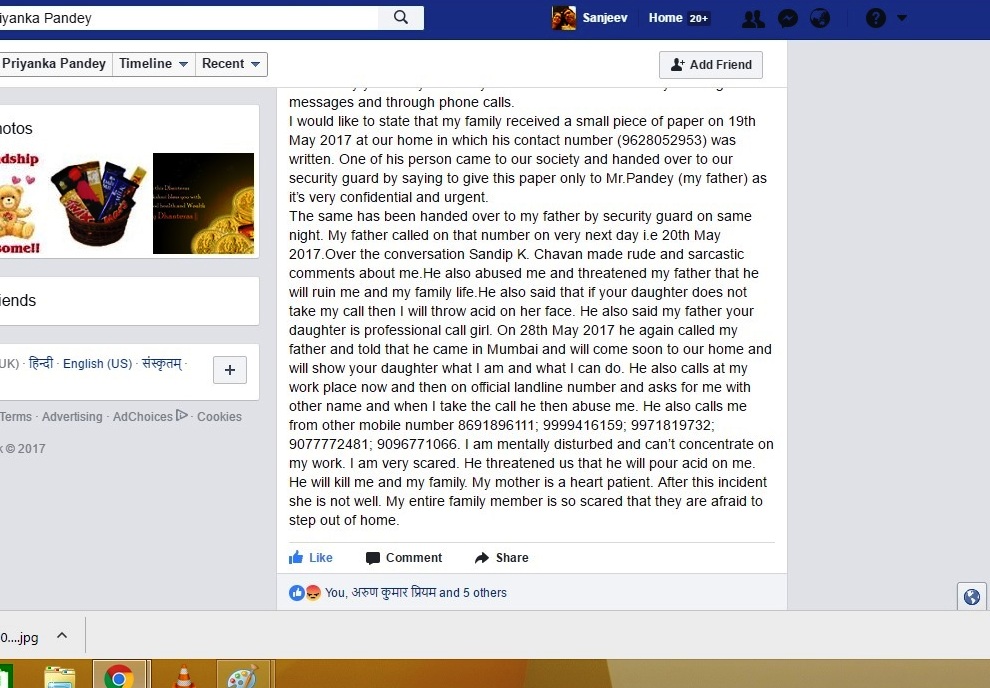 प्रियंका के फेसबुक पोस्ट के अनुसार संदीप ने न सिर्फ उसे धमकियां दी बल्कि इस आशय की धमकी उसने उसके पिता तक भिजवाई. लिखित धमकी अपने फोन नम्बर के साथ उसने अपने एक दोस्त के माध्यम से मेरे सेक्युरिटी गार्ड के मार्फ़त दी. बंद लिफ़ाफ़े में वेरी अर्जेंट लिखा हुआ था , जिसे देते हुए सेक्युरिटी गार्ड को कहा गया कि इसे मिस्टर पाण्डेय को देना.