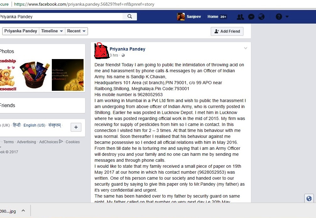 दो सालों से परेशान प्रियंका ने आज अपने फेसबुक पेज पर इस आशय का मेसेज डाला है. प्रियंका ने फेसबुक पर अपनी बात कहने के पहले डिफेन्स सचिव संजय मित्रा, और महिला आयोग को अपनी शिकायत भी भेजी है और स्त्रीकाल से बात करते हुए उन्होंने कहा कि आज मुम्बई के एक थाने में उसके खिलाफ शिकायत भी दर्ज करा रही हूँ . एक पेस्टीसाइड कंपनी में कार्यरत प्रियंका ने बताया कि ‘ मैं तंग आकर उसके खिलाफ फेसबुक पर सार्वजनिक तौर पर आई हूँ. प्रोफेशनल काम के सिलसिले में संदीप मुझे मिला था, तब वह लखनऊ में पोस्टेड था. वह सेना की ओर से पेस्टिसाइड के ऑर्डर के लिए आता था. शुरू में वह इस सिलसिले में मुझसे बातें करता था, तब उसका व्यवहार नॉर्मल था. उसके बाद वह पजेसिव होने लगा मेरे प्रति. मैंने मई 2016 से उससे प्रोफेशनल रिश्ते तोड़ लिए.’ वह इसके बाद अलग-अलग नंबरों से फोन कर प्रियंका को धमकियां देने लगा. प्रियंका के अनुसार उसने इन नंबरों से फोन कर उसे धमकी दी है : 8691896111; 9999416159; 9971819732; 9077772481; 9096771066.