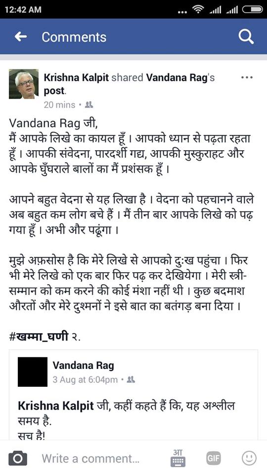 कृष्ण कल्पित जी,मैं एक प्रगल्भ माँ थी और आप बीए में पढ़ने वाले किशोर ।मेरी कहानी और आपकी कालजयी कविता “बेटा इकलौता” आदरणीय भारती जी ने बड़े विज्ञापन करके छापा था। तबले आपकी प्रतिभा की मैं क़ायल हूँ । आपने भी सदा बड़ी बहन वाला आदर दिया है।आप हमारे शहर में दो बार अधिकारी बन दूरदर्शन में आये जो साहित्यकारों के विचरण का स्थल है ज़ाहिर है हम मिलते रहे। कभी आपको अभद्र नहीं पाया। आपने यहाँ परिश्रम किया यह हम देखते रहे। आपने कई बार जिसे पसन्द नहीं किया उसे भी बुलाते रहे ।आपकी छवि मेरे मन में सदा एक किशोर की रही। साहित्य आपका ओढ़ना बिछाना है । उसके सहित को लेकर चलने में क्या हर्ज है? मुझे पता है आपकी मात्र एक बिटिया है ,क्या उसे महिलाओं के सम्बन्ध में आपके ये विचार (जिसे अपशब्द कहे और जिसका नखशिख वर्णन किया)रुचेंगे?