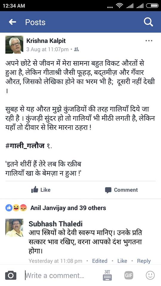 कवि कृष्ण कल्पित ने एक सम्मान में निर्णय के बहाने निर्णायक अनामिका के खिलाफ एक निहायत आपत्तिजनक टिप्पणी की, जिसका स्वाभाविक रूप से विरोध हुआ. विरोध के जवाब में कल्पित विरोध करने वाली लेखिकाओं के खिलाफ भी उसी अंदाज में हमलावर हुए. शुरू में उनसे माफी की मांग भी उठी जो धीरे-धीरे उनके अपने गिरोह की सक्रियता के असर से कमजोर भी होने लगी है. कल्पित के हमले न सिर्फ सेक्सिस्ट हैं उनकी प्रशंसाएं भी उतनी ही सेक्सिस्ट हैं. मसलन उनके तीन पोस्ट की बानगी है: