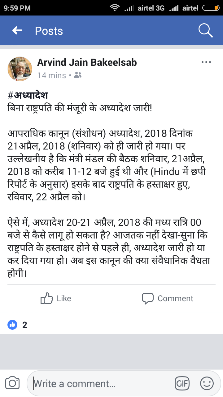 क्या केंद्र सरकार सारी संवैधानिक संस्थाओं को नष्ट करने की मुहीम पर है या सरकार के मुखिया, प्रधानमंत्री नरेंद्र मोदी, स्वयं को ही सरकार और संविधान दोनो समझते हैं? यह सवाल उठ रहा है सरकार द्वारा हाल में जारी अध्यादेश पर, जिसमें बलात्कार को लेकर फांसी की सजा का प्रावधान किया गया है. सरकार और शासक पार्टी भाजपा वैसे भी सवालों के घेरे में है कि एक ओर कठुआ बलात्कार के मामले में बलात्कारियों के पक्ष में सड़क पर उतरे भाजपा विधायकों पर पार्टी कोई कार्रवाई नहीं कर रही है, कर्नाटक विधान सभा में पोर्न देखने वाले अपने नेताओं को टिकट दे रही है, उन्नाव बलात्कार मामले में गिरफ्तार भाजपा विधायक को निलंबित तक नहीं कर रही है, वहीं दूसरी ओर जनाक्रोश को देखते हए अध्यादेश लेकर आ रही है, जिसकी संवैधानिक वैधता पर ही सवाल उठ रहे हैं.