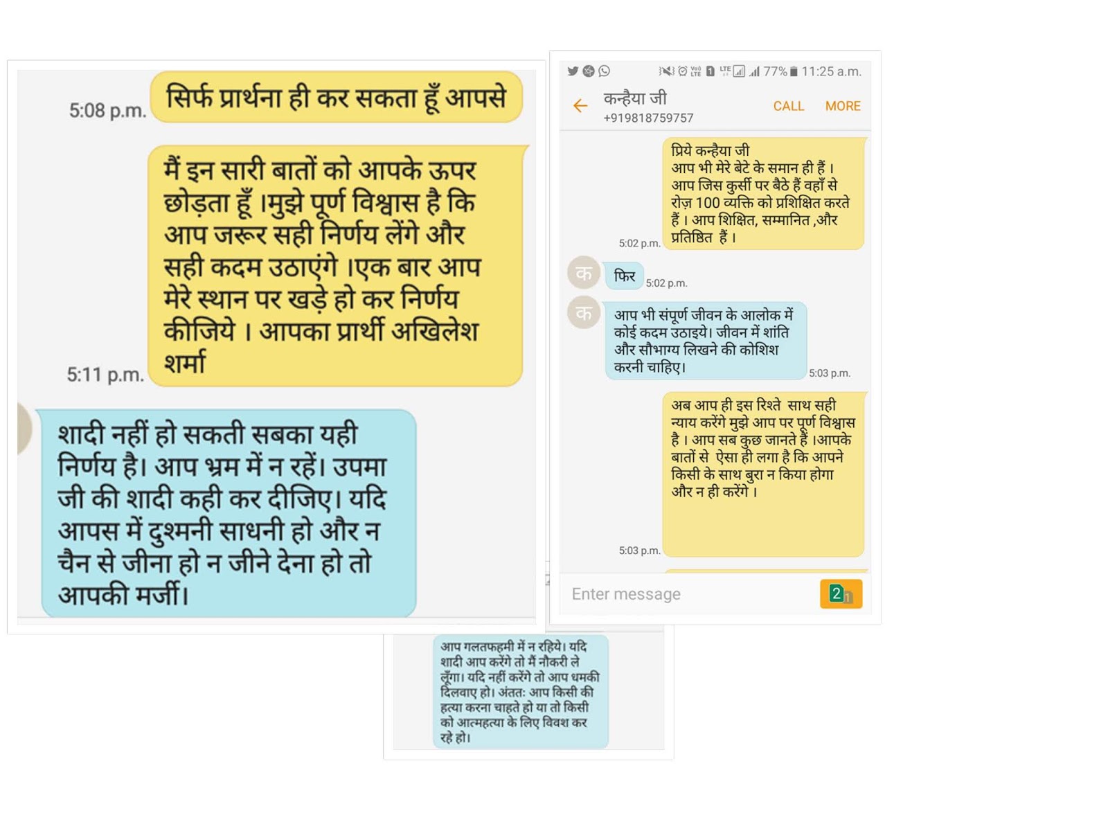 आगारा की एक डीम्ड यूनिवर्सिटी से पीएचडी कर रही है उपमा ने ‘स्त्रीकाल’ से बातचीत करते हुए बताया कि ‘प्रदीप ने उससे सोशल मीडिया पर संपर्क साधा और दो सालों से उसके साथ प्यार का नाटक करता रहा. शादी का झांसा देकर शारीरिक शोषण भी किया, लेकिन जब बात शादी की आयी तो मुकर गया.’ उपमा के अनुसार इस सारी घटना की जानकारी दोनो पक्ष के परिवारवालों को थी. लेकिन जैसे ही शादी का प्रसंग आया तो कन्हैया त्रिपाठी ने उसे छोटी जाति का बताते हुए उसे प्रदीप से दूर रहने की धमकी दी. गौरतलब है कि पीडिता भी सवर्ण जाति (भूमिहार) है और त्रिपाठी भी (ब्राह्मण). पीडिता के अनुसार कन्हैया त्रिपाठी ने उसे और उसके पिता को देख लेने, नौकरी से निकलवा देने की धमकी दी, अपनी ऊंची पहुँच का हवाला दिया और यह भी कहा कि ‘प्रदीप को जाति की लडकी से शादी कर लेने दो फिर तुम चाहो तो उसके साथ रह सकती हो.’ नीचे की तस्वीर कन्हैया त्रिपाठी का उपमा शर्मा के पिता से बातचीत का स्क्रीन शॉट है. नीला कलर का टेक्स्ट कन्हैया त्रिपाठी द्वारा भेजा गया टेक्स्ट है.